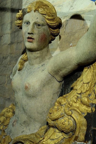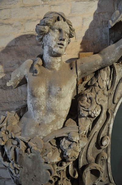 Detail des Epitaphs, ein Engel vor der Restaurierung im Sommer 2008.